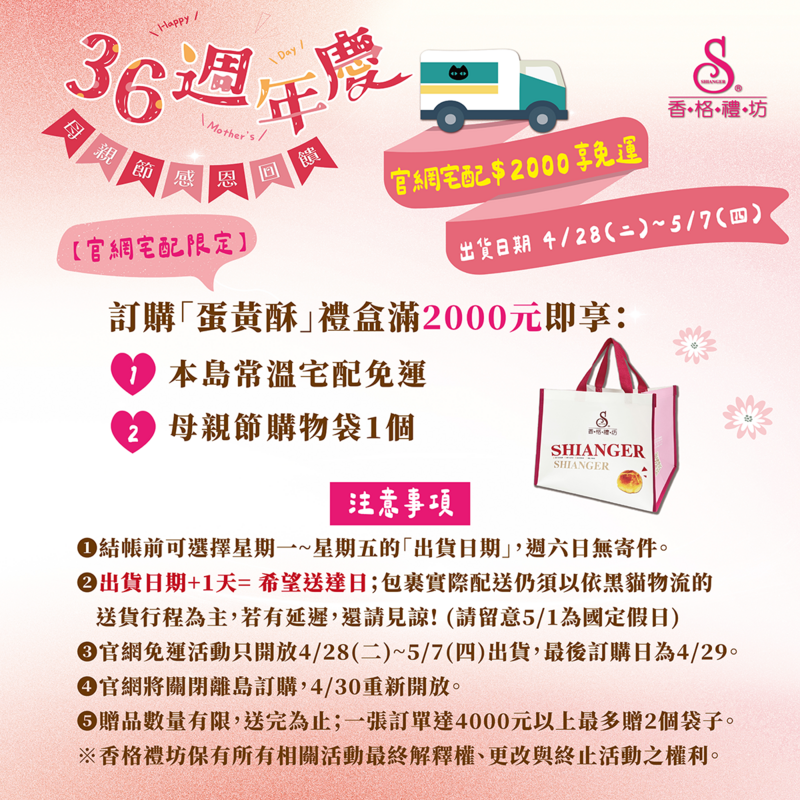 母親節與您同慶~~🎀官網宅配限定|即日起訂購出貨日4/28~5/7的蛋黃酥禮盒,滿2000元享常溫宅配免運+贈購物袋一個!